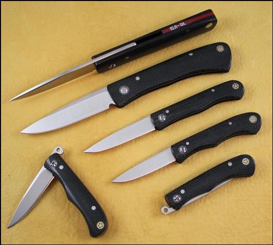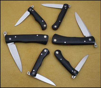 Friction Folders: The oldest known folding pocket knife was found in Hallstatt, Austria dating back to 600BC and guess what, it was a friction folder. If you don't know what a friction folder is it's a simple knife that has no lock or spring and is held open and closed by the friction between the handle slabs and the blade. It doesn't get much simpler than that and that's its beauty. If you use one of these knives like it's designed to be used, for cutting, not stabbing, you'll really enjoy their light weight, clean and simple design and performance on all those everyday things you carry a pocket knife for. I've been carrying several of these as my everyday shop knife for the past couple of years and loving them. Yes, I said several of them since every time I show it to someone they seem to talk me out of it and I have to make myself another one to replace it, but that's not such a bad thing is it. I've turned quite a few folks on to these little gems that way. For steel I've used 1095, carbon "Alabama Damascus" and ATS-34 for blades. I like Micarta for handles because of it's light weight to strength ratio, toughness and I think the canvas and linen varieties make beautiful handles too. I make them in a couple of sizes and styles and am coming up with new patterns all the time. Here's what's new. |