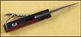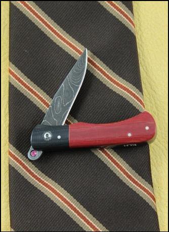 On the right: Tie Clasp If you live your life wearing suits and ties this might be just the accessory for you. 4" Overall Open with a 1 1/2" "Alabama Damascus" blade with a 1/8" man made ruby set in the opening tab of the blade - 2 3/8" Closed. Red and Black Linen Micarta handle with tie clip back. $250 |