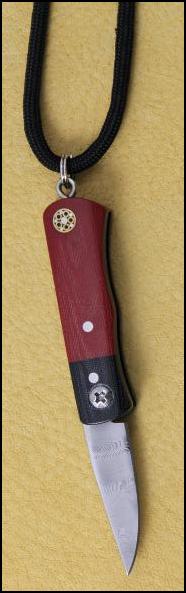 On the left: Necklace or Fob Wear it as a necklace or as a watch or keychain fob this little Mini is 3 1/2" Overall Open - with a 1 3/8" Damasteel Blade - 2" Closed. It has two tone black and red linen Micarta handles, stainless pins and screw with a mosaic pin - $200.