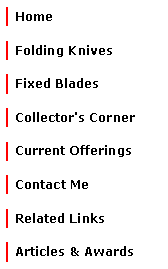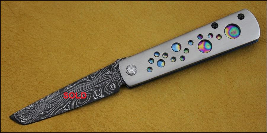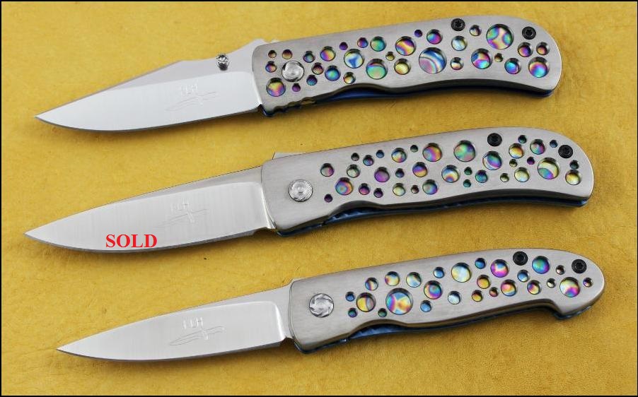 I make a variety of Titanium handled folders in many sized and styles. They are available with either sandblasted or satin finished handles and I can anodize the frames in a range of brilliant colors. The three knives pictured below have all been anodized with my “Galaxy Pattern” that looks like oil on water or a slice of the Milky Way in the night sky and it's become a customer favorite. Prices for these three with satin finished handles are $400 each. The blade steels are from top to bottom: ATS-34, CPM-S30V & CPM-S30V and the middle and bottom knives are Flippers. |